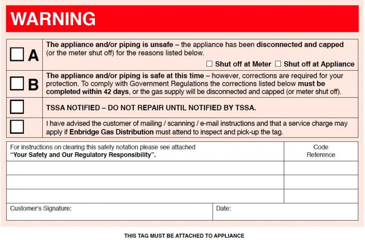 Type A red tag warning from Enbridge , TSSA or a licensed Ontario gas fitter.